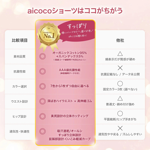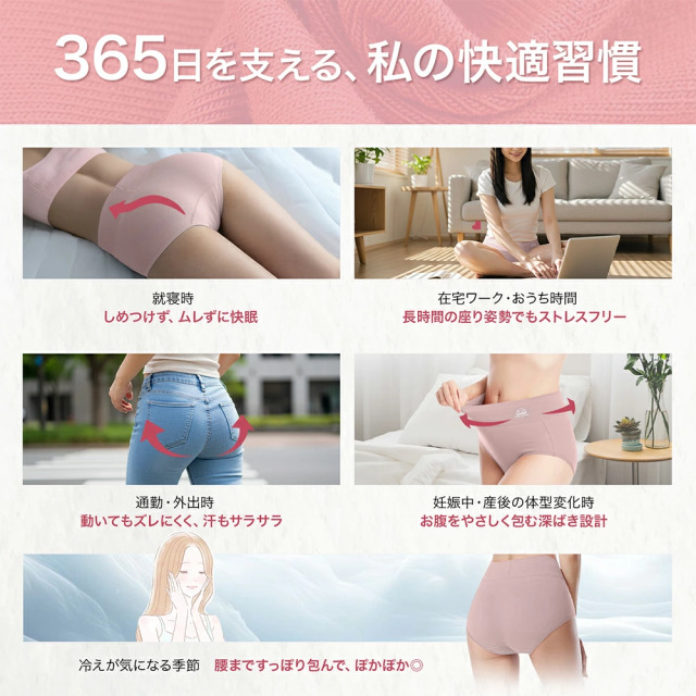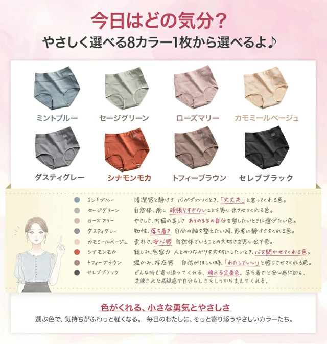 自然体のあなたに、ちょうどいい。 優しいハーブカラーで、毎日を心地よく。ナチュラルに彩る、やすらぎショーツ。 肌に寄り添う、優しいハイウエスト。 大人のためのくすみハーブカラーショーツ。 お腹まですっぽり、心地よい毎日へ。 敏感肌さんにも安心。綿95%のやさしさ。 \選べるナチュラルなくすみ系ハーブカラー8色/ 落ち着き感があり心までほぐれるような、やさしいトーンのくすみカラーで、毎日にやさしさを添える色展開。 ・ローズマリー:やわらかなピンクグレージュ ・カモミールベージュ:まろやかなヌードベージュ ・セージグリーン:涼しげで癒されるくすみグリーン ・トフィーブラウン:温かみのあるキャラメルブラウン ・シナモンモカ:落ち着いた甘さのモカブラウン ・ミントブルー:爽やかなくすみブルー ・ダスティグレー:ニュートラルで洗練されたグレー ・セレブブラック:どんな時も寄り添ってくれる、頼れる定番色。落ち着きと安心感に加え、洗練された高級感で自分らしさをしっかり支えてくれる。 「これがあってよかった」と思えるものだけ。 自分らしさを、もうちょっと好きになれる毎日へ。 ※こちらの商品はハーブにインスパイアされた、やさしいカラー展開でありハーブ成分は含まれておりません。